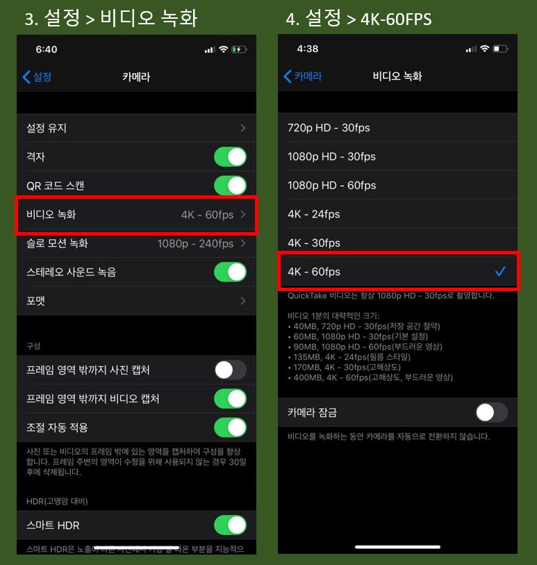 카메라 영상 해상도 설정을 확인하여 4K-60fps 로 설정이 가능하다면 유튜브 영상까지 큰 무리없이 영상 업로드가 됩니다. 아직도 많은 유튜버들이 핸드폰을 이용하여 해상도 설정을 공유 드린것과 같이 하여 활동을 하고 있습니다.
