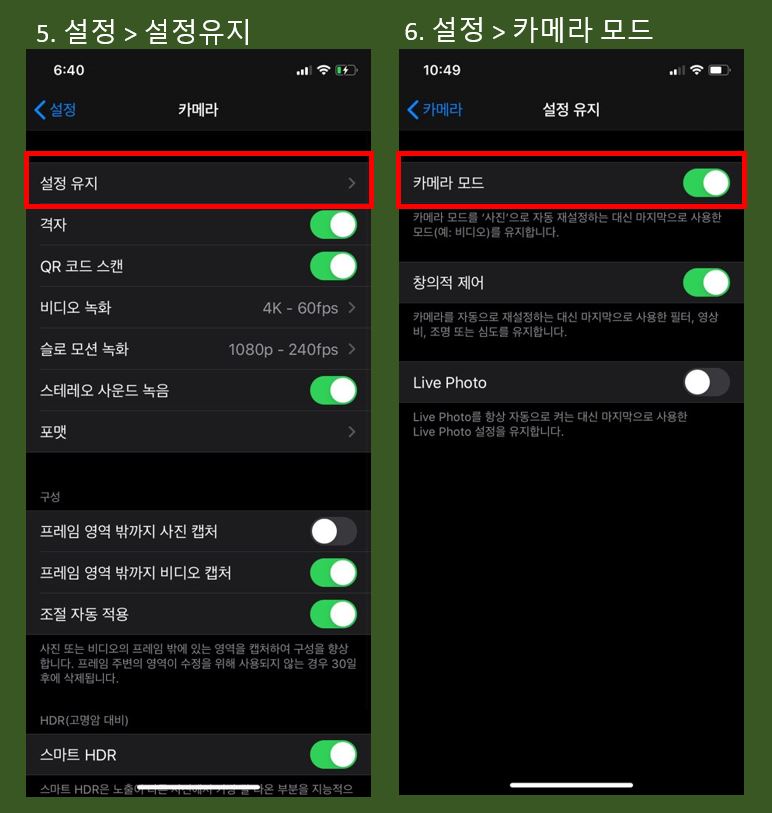 6. 설정유지에 들어가 카메라 모드를 활성화 합니다.