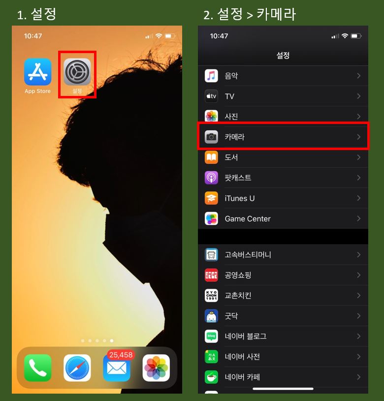 3. 설정의 카메라에서 비디오 녹화 설정 상태를 봅니다.
