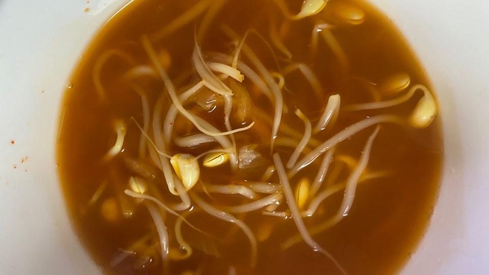▼ 김치국물과 김치를 잘게 넣어주었지만 간을 봐줘야합니다. 아직 무언가가 부족하다면 국간장과 소금으로 간을 더 봐줍니다. 아니면 김치국물을 이용하는 방법이 있는데 김치국물로 간을 보게되다 보면 너무 진한 콩나물국이 될수 있습니다.