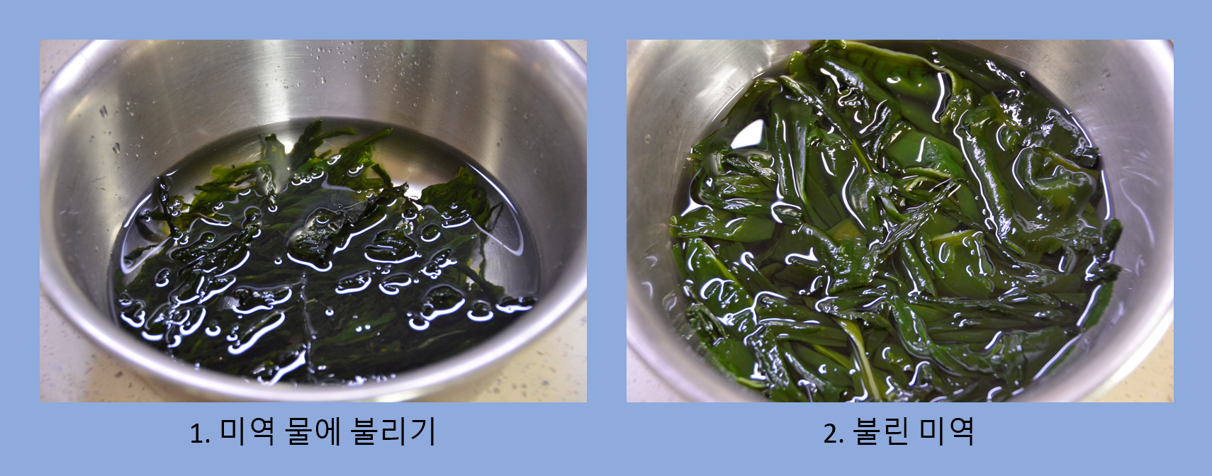 1. 미역을 적당량 덜어서 물을 붓고 미역이 불을 때까지 기다려줍니다.