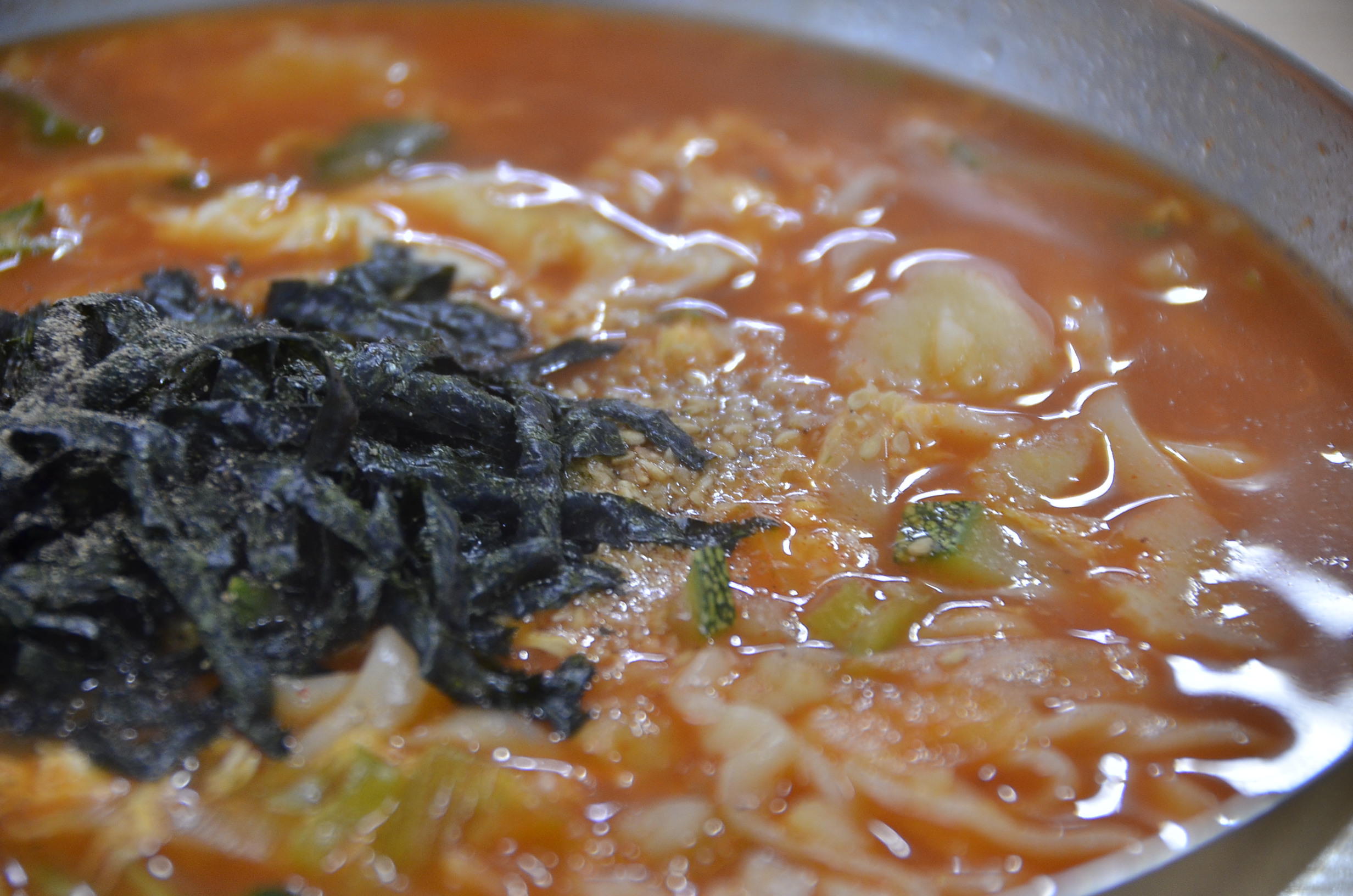▼ 오랜만에 다시 만나는 장칼국수가 나왔습니다. 장칼국수는 된장과 고추장으로 만드는 강원도의 대표 향토 음식입니다. 대우칼국수의 장칼국수는 오랜 세월을 이곳에서 묵호항에 들어오는 어민들과 동해 시민들을 따뜻하게 만들어주었던 음식입니다. 아래 사진에서는 호박, 감자, 김 그리고 칼국수의 재료가 들어가 있습니다.