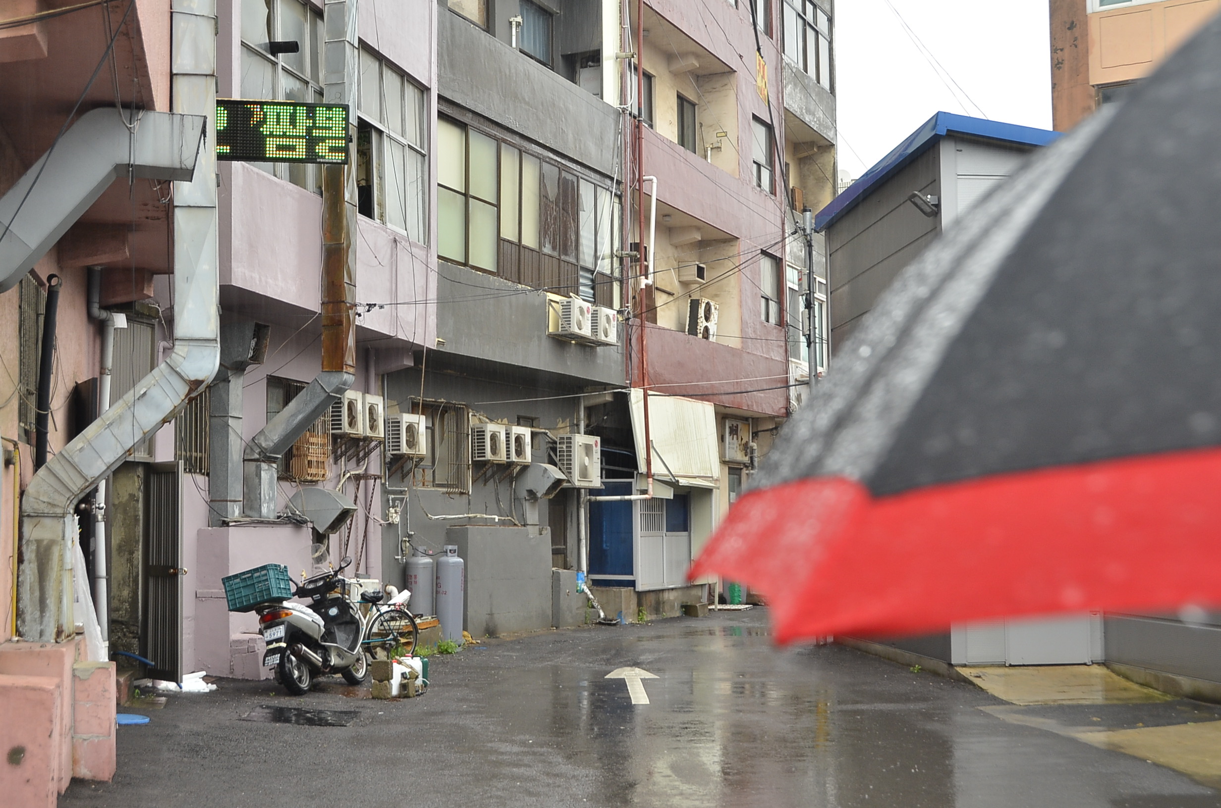 ▼ 비 내리는 날 우산을 받쳐 들고 대우칼국수를 찾아가는 아들