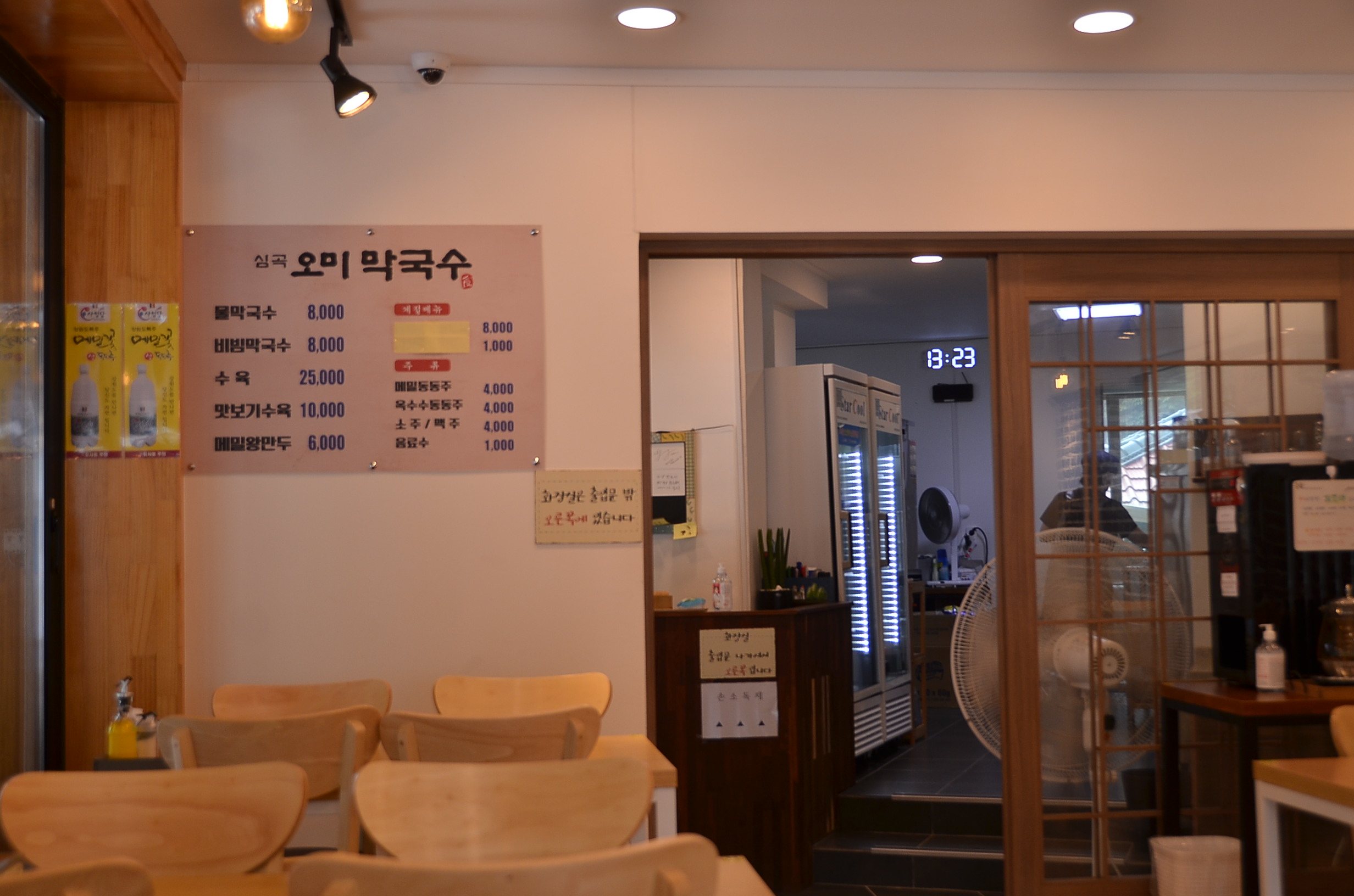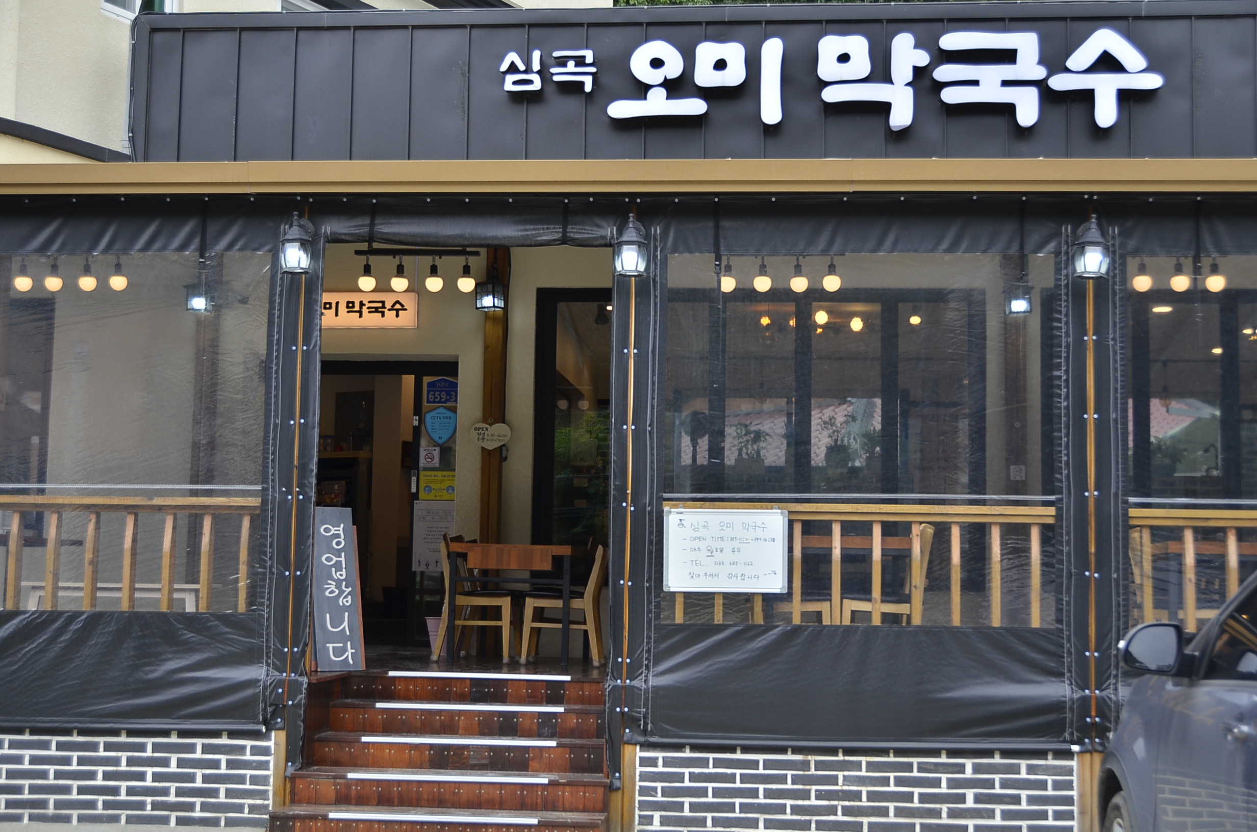 ▼ 심곡항에서 정동진 선크루즈 방향으로 100~200M 떨어진 거리 좌측에 위치한 심곡 오미 막국수입니다. 원래 이 자리엔 한옥으로 한식당이 위치해있었는데, 깨끗한 건물로 바뀌어 오미 막국수를 전문으로 하는 식당으로 바뀌어 있네요. 이 식당을 본 아들은 막국수를 꼭 먹어야 한다고 합니다.