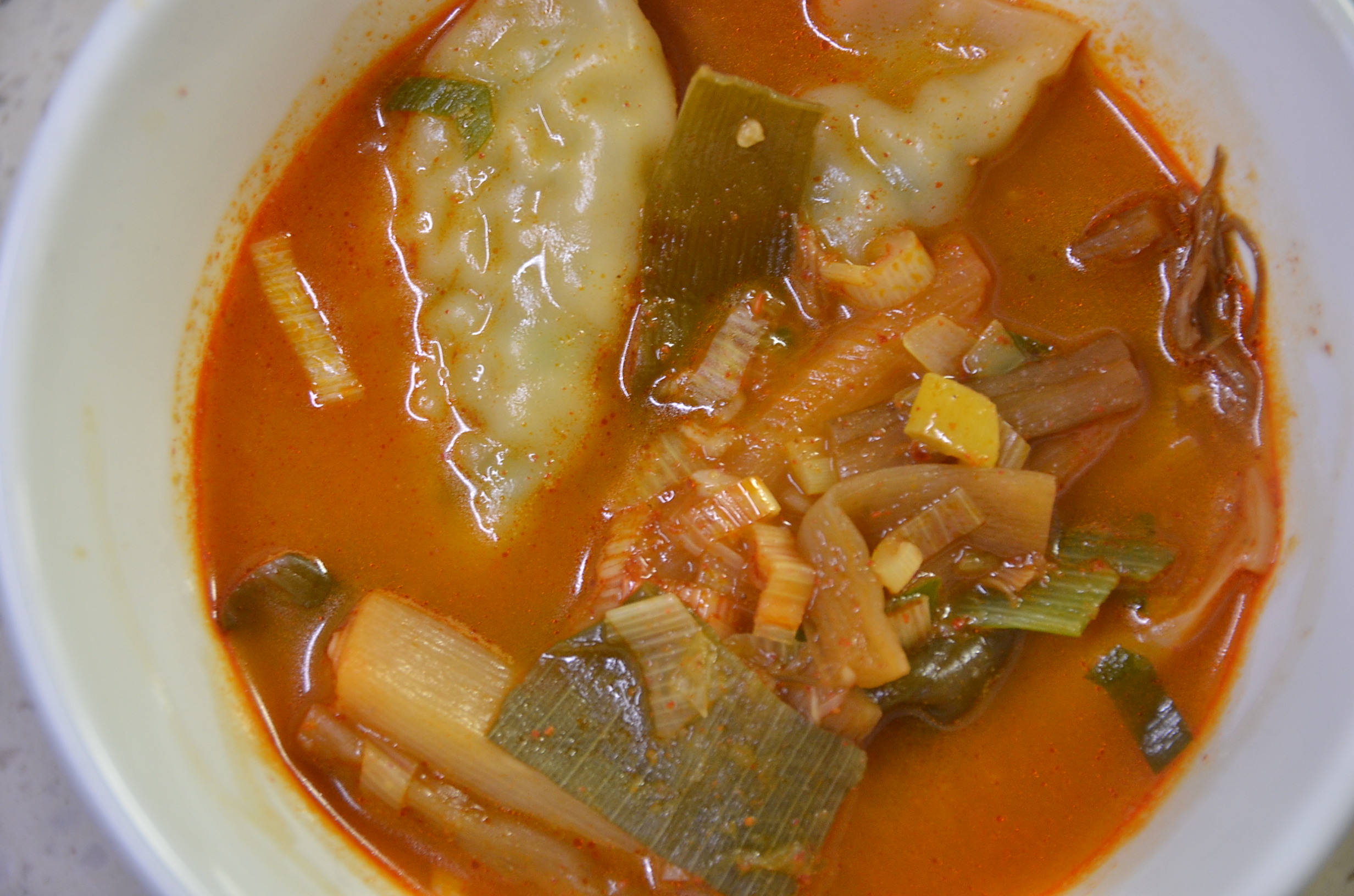 국물은 정말이지 얼큰한 것이 눈에도 보일 정도이며, 깊고 진한 육개장입니다. 육개장의 진한 국물을 잔뜩 머금고 있는 비비고 만두도 맛있어 보입니다.