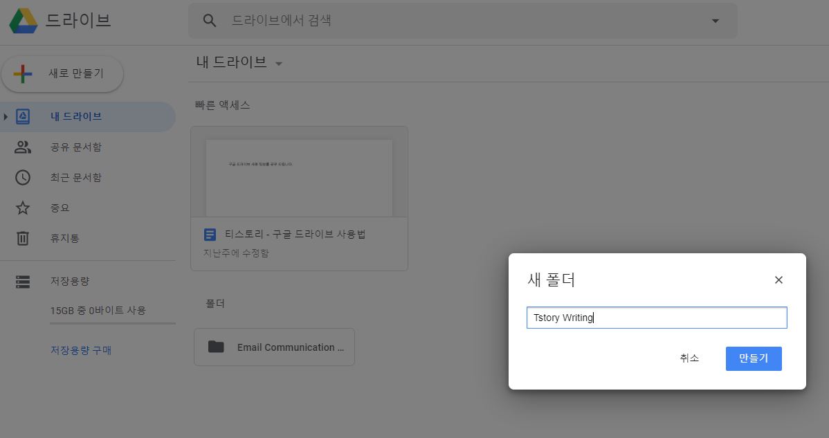 ▼ 글을 잘 쓰고 싶은데, 학창시절 문학과 공부에는 특히 책 읽기에는 담을 쌓아온 저이기에 티스토리에 글을 적는 것이 결코 쉬운 일이 아닙니다. 그래서 저는 구글 드라이브에 티스토리에 포스팅할 내용을 먼저 이렇게 구글 문서를 통해 만들어 놓는 것을 좋아합니다. 저의 폴더명은 Tstory Writing입니다. 원하시는 제목의 폴더명을 기입하여 만들면 됩니다.