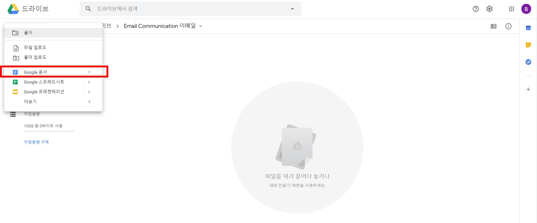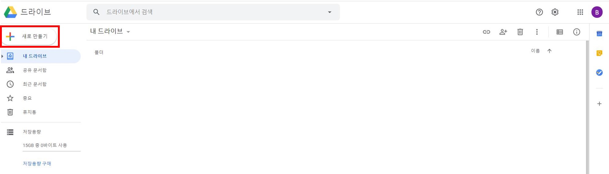 그다음에는 업무와 심지어는 아들 공부에 함께 할 수 있는 구글 문서, 구글 스프레드시트, 구글 프레젠테이션을 만들 수 있습니다. 저는 먼저 각종 문서를 한 곳에 저장하기 위하여 폴더를 생성하겠습니다.