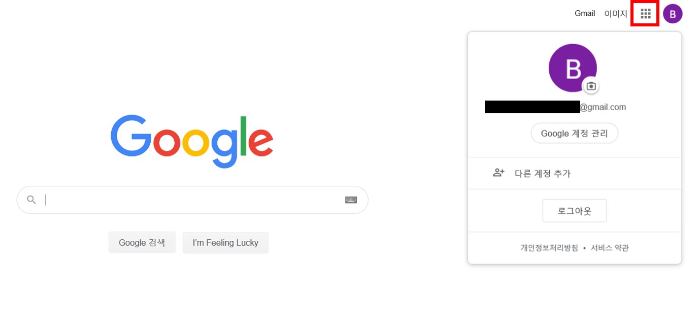 ▼ 구글 개인계정으로 로그인을 합니다. 로그인을 하여 우측 상단의 사각점 9개를 클릭합니다.